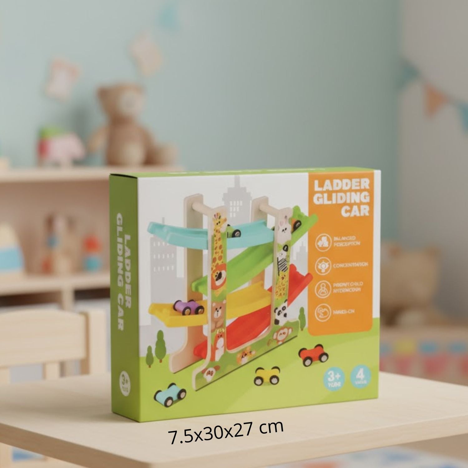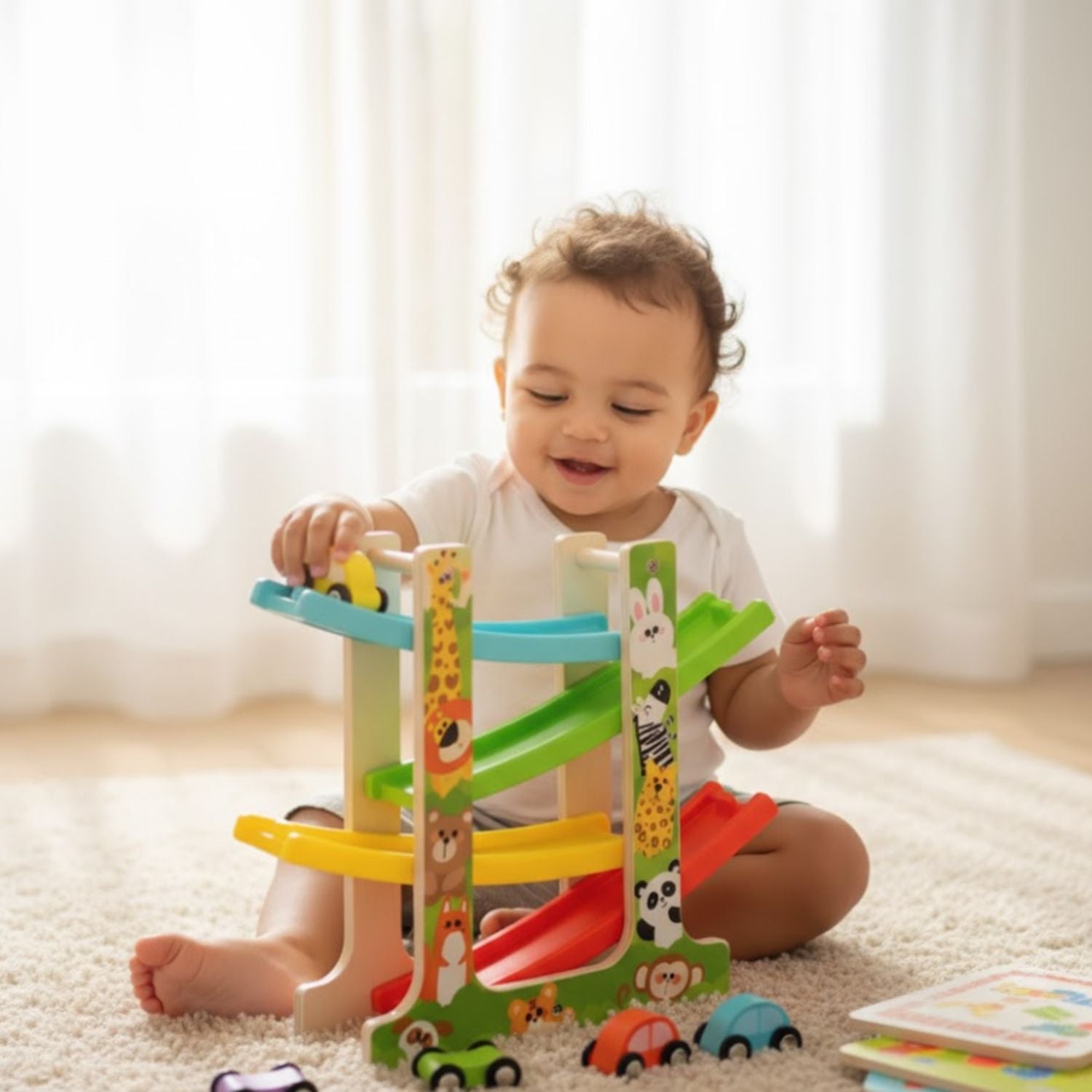 Les rampes aux inclinaisons variées éveillent la curiosité et permettent à l’enfant de comprendre la gravité et la vitesse en observant les voitures descendre à des rythmes différents. Une aventure captivante qui allie plaisir, apprentissage et émerveillement.