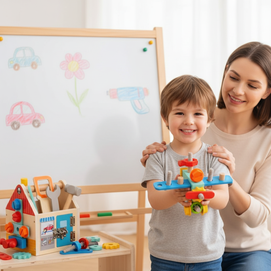 Avec ses 33 pièces variées, MiniBrico invite les enfants à inventer moto, avion ou créations uniques, renforçant leur confiance en soi et apportant aux parents des moments de calme précieux.