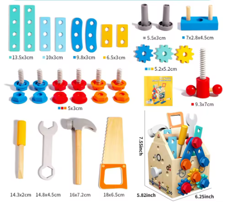 ✅ Nombre de pièces : 33 éléments (vis, écrous, engrenages, outils)