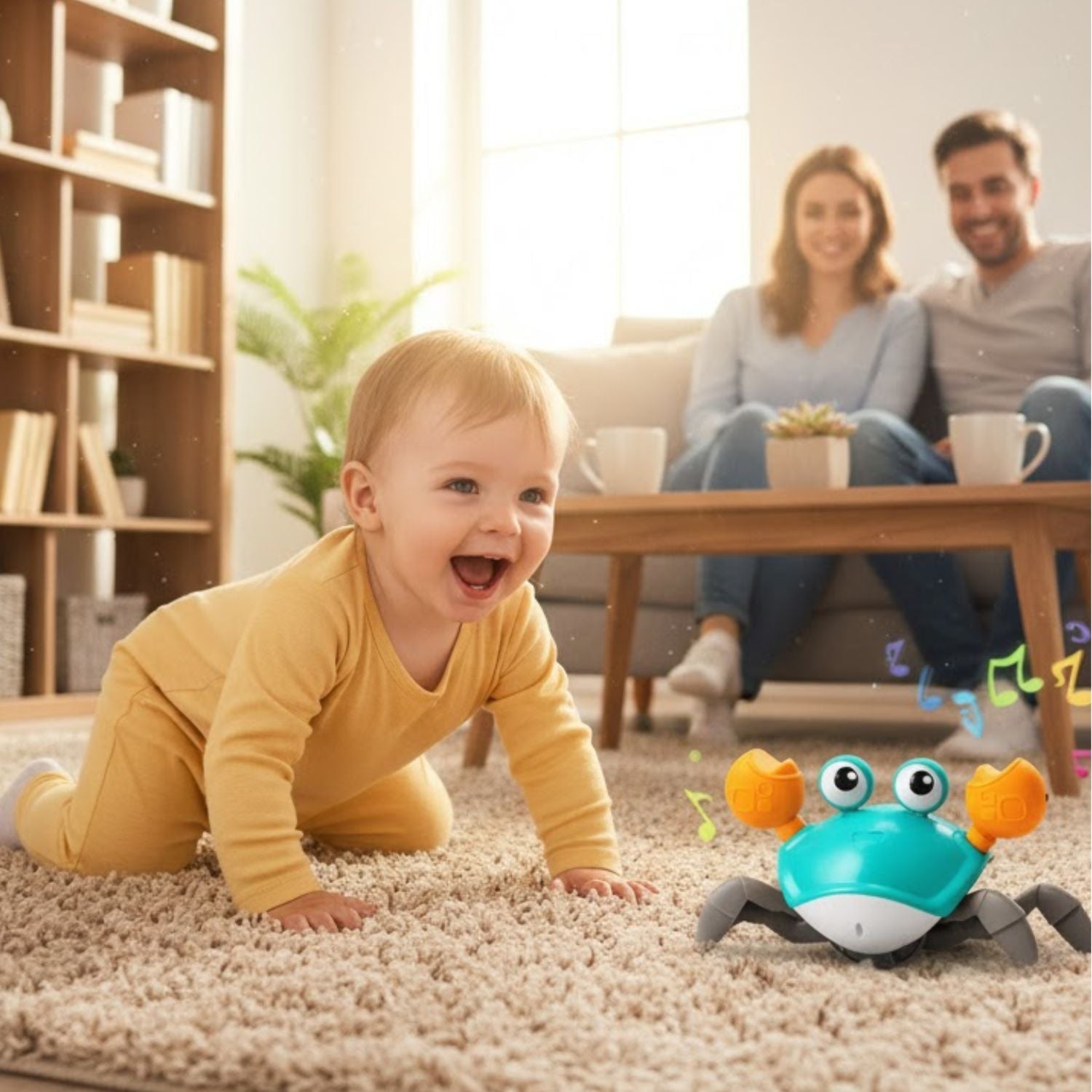 Crabot est un jouet malin et amusant, équipé de capteurs qui détectent les obstacles, lui permettant ainsi de les éviter et de prendre la fuite de l'autre côté. Crabot aime s'amuser avec nous.