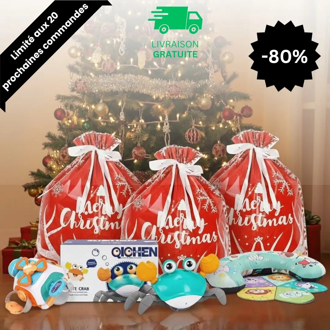 - Grand Sac Cadeau de Noël: Ce grand sac à cordon de serrage (57 x 44 cm) est idéal pour un emballage cadeau rapide et élégant. Sa taille généreuse permet de contenir facilement la boîte du Crabe et plusieurs autres surprises de Noël.