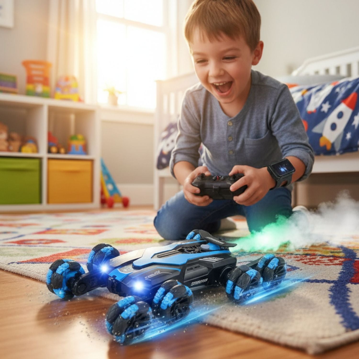Avec ses roues pivotantes à 360° , la Voiture télécommandée à roues pivotantes – FlexiRacer, glisse sans effort sur escaliers et terrains difficiles, pour que chaque aventure de votre enfant soit pleine de joie et de liberté.