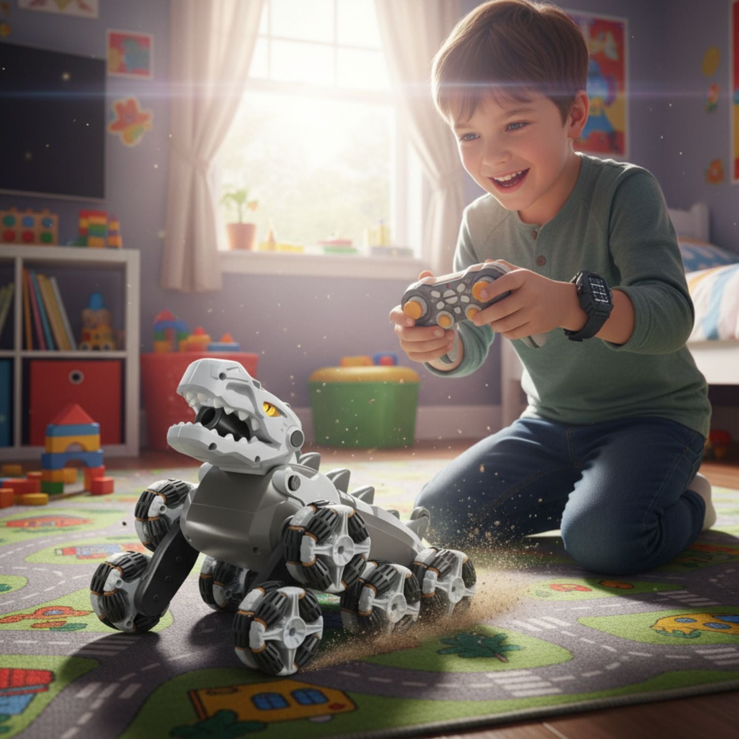 Fini les jouets qui se bloquent sur tous les sols ! a Voiture télécommandée tout terrain dinosaure 8WD -DinoDrive conquiert sable, herbe et tapis grâce à ses 8 roues omnidirectionnelles 360° . L'imagination de votre enfant s'envole et les parents savourent des moments de jeu sereins.